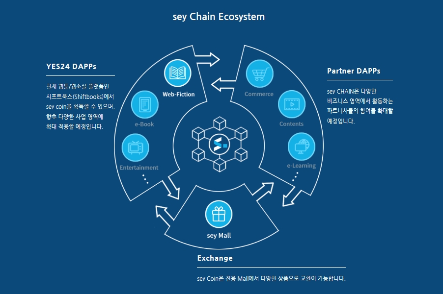독자들은 디지털 콘텐츠 플랫폼 시프트북스에서 마음에 드는 작품을 응원하는 활동을 통해 sey코인을 획득할 수 있고 작가들 또한 독자 응원 순위에 따른 보상으로 sey코인을 받을 수 있다. sey코인은 sey코인몰에서 공연 티켓, 영화 시사회, 예스24 제작 굿즈, 음료 등을 응모, 교환 받는 데 사용할 수 있으며 모바일 지갑 앱 ‘sey Wallet’을 통해 다른 사람들에게 선물할 수도 있다. 기존 이더리움 기반 암호 화폐 sey토큰은 sey체인 론칭과 동시에 sey코인으로 1:1 교환이 진행된다.